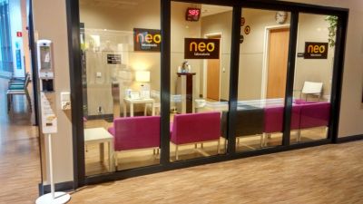 Новое современное здание, с такой площадью остекления как будто клиника расположена не в снежной Финляндии, а где-то в тёплых курортных странах. Весь первый этаж клиники занимает… тёплая парковка. Если вам когда-нибудь приходилось выходить из машины на морозе, пытаясь не поцарапать авто костылями, не поскользнуться и не упасть, а также найти у себя третью руку, чтобы закрыть дверь, то вы поймёте продуманность такого решения. Вместо лестницы – траволатор. Из-за отсутствия ступеней на траволаторе гораздо удобнее и легче перемещаться с инвалидной коляской или костылями. В клинике Neo занимаются ортопедической хирургией «одного дня»: артроскопическими операциями на всех крупных суставах, хирургией кисти, стопы, хирургическим лечением спортивных травм. В клинике оперировались президенты, звёзды мирового футбола, олимпийские чемпионы. При этом клиника совсем не похожа на клинику: нет больничных запахов, современный интерьер выполнен в ярких тонах.